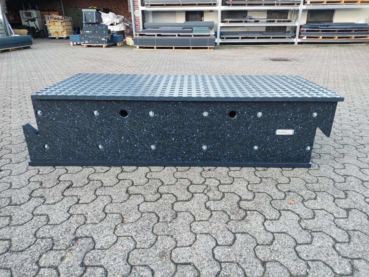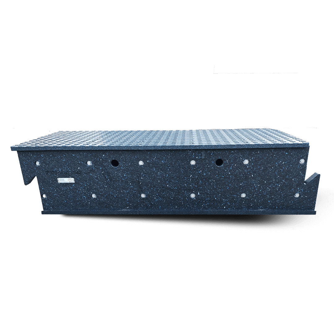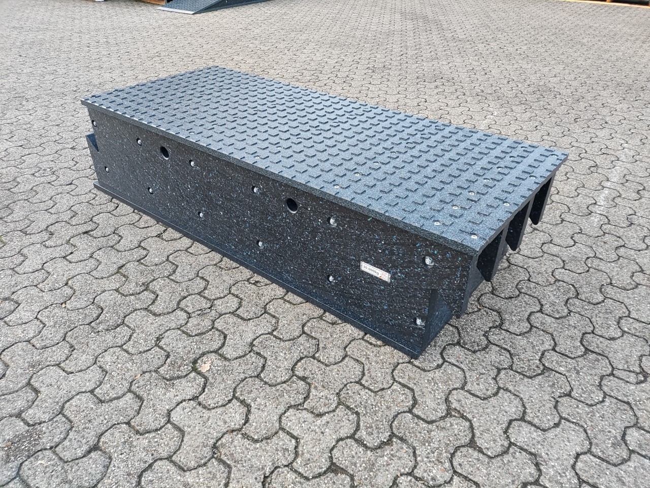 Modulrampe 1.1 Zwischenteil in gerader Ausführung. Ohne Steigung. Die Gripfräsung der Fahrfläche sorgt für einen sicheren Halt der Räder oder Laufketten, die verbaute Bodenplatte für einen sicheren Stand der Rampe. Die selbst arretierende Verbindung ist beidseitig komplett aus Hochleistungs Kunststoff gefertigt. Die abgebildete Rampe ist nach Kundenangabe gefertigt und hat eine Nutzlast von 30.000 kg. Andere Nutzlasten auf Anfrage möglich.