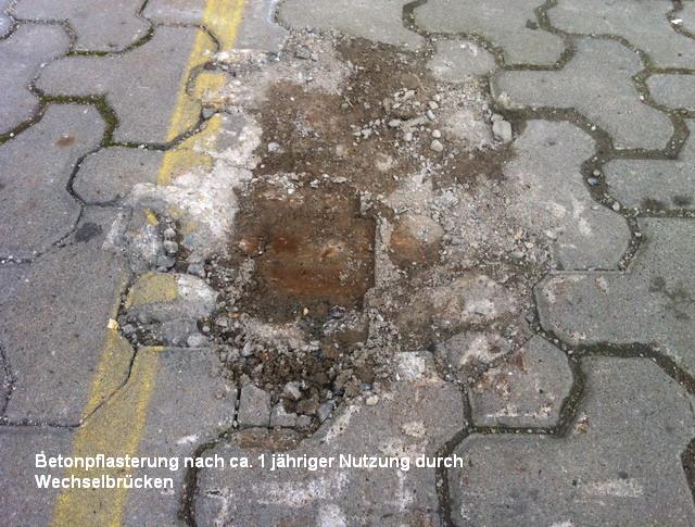 Werden Wechselbrücken immer auf der gleichen Stelle vor der Laderampe abgestellt, ist die Pflasterung nach kurzzeitiger intensiven Nutzung beschädigt.
