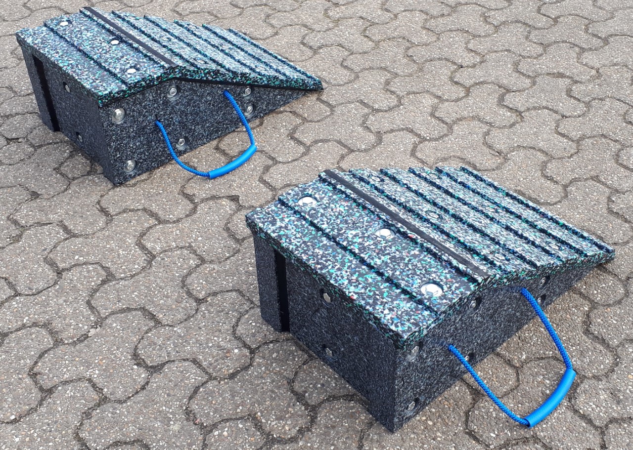 - Die Rampen sind durch Handgriff- Schlaufen (je nach Gewicht, bis zu 4 Stück pro Rampe) manuell zu bewegen und können auf Wunsch eine Antirutsch – Fräsung auf der Fahrfläche erhalten.